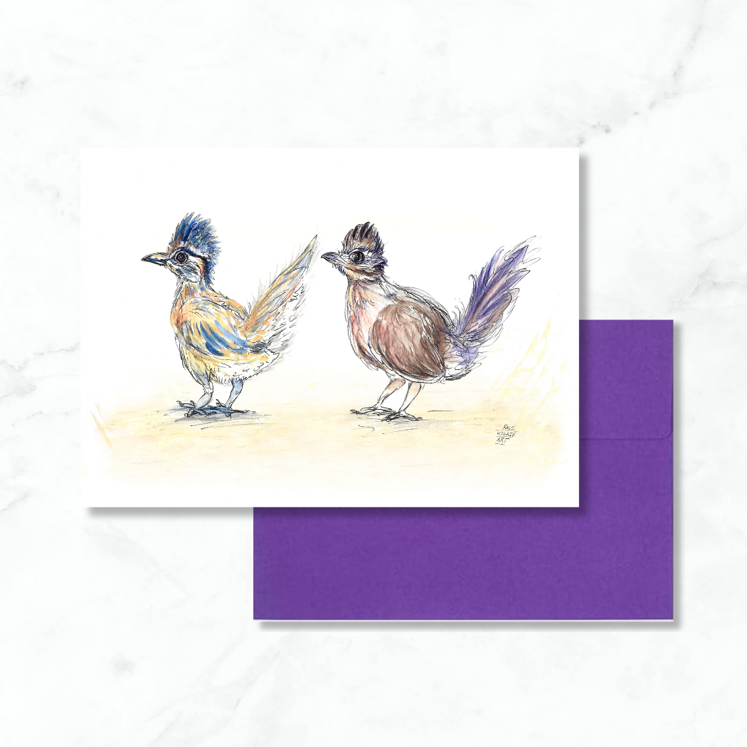 This playful greeting card features two curious baby roadrunners—drawn with charm and a splash of desert whimsy. Perfect for birthdays, just-because notes, or anyone who could use a smile and a little desert sunshine.