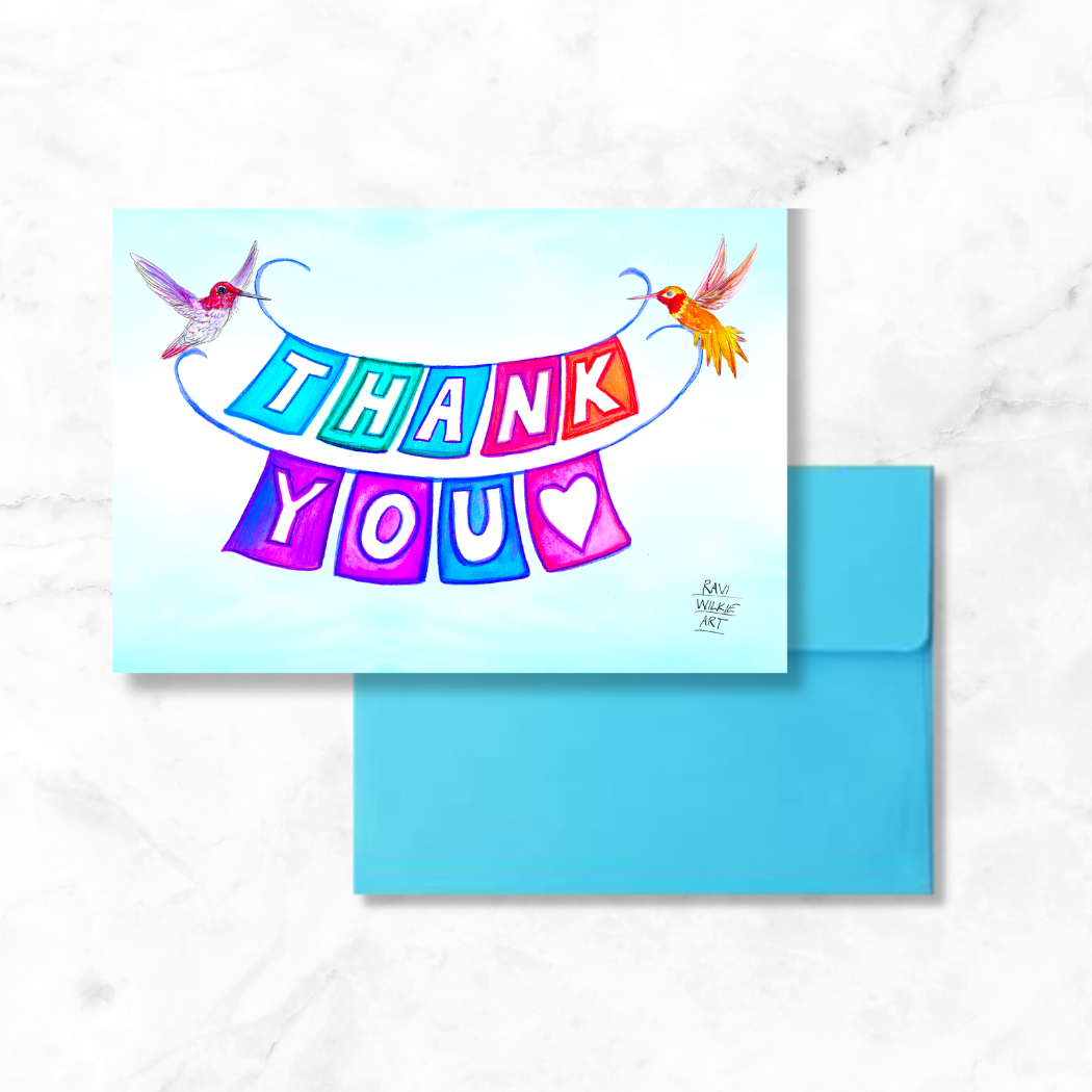 Brighten someone’s day with this colorful Thank You greeting card. Two vibrant hummingbirds carry a festive banner across a clear desert sky—perfect for sending gratitude with heart and style.